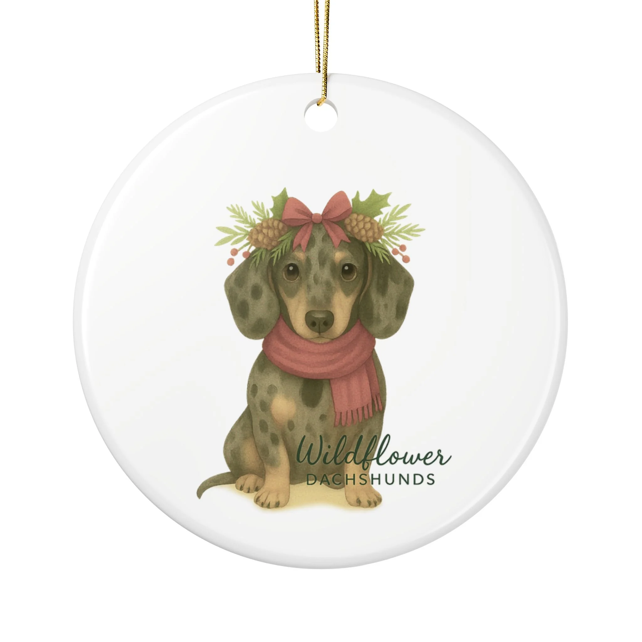 Bring a touch of dachshund magic to your holiday tree with this exclusive Wildflower Dachshunds ceramic ornament. Featuring our signature whimsical longhair dachshund artwork, this keepsake adds charm, warmth, and personality to any Christmas décor.