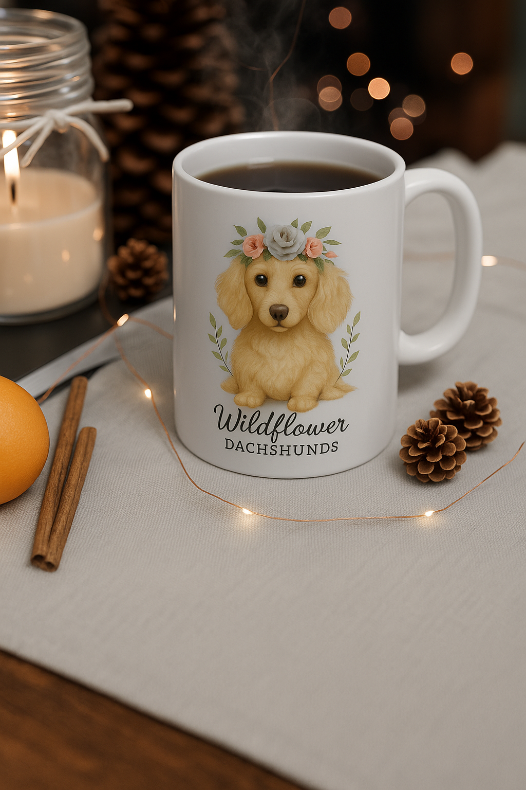 Start every morning with a touch of Wildflower charm. This Cream Dream Dachshund Mug features our classic three-dachshund crest surrounded by soft florals, creating the perfect blend of cozy and elegant.